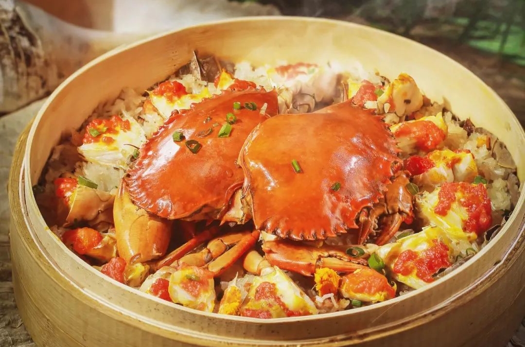 沿海城市的菜色以海鲜为尊,例如福州乡宴的开席大菜红鲟饭,正是取材于福建盛产的有膏青蟹,闽江口近海,这里的红鲟个大肉肥、膏红、味美。红鲟的鲜味和糯米饭的软糯完美融合,沁入到宾客的味蕾之中。