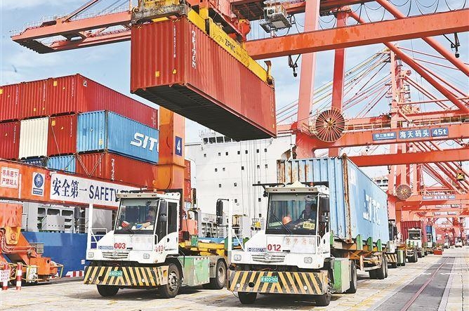 集装箱船舶一字排开,42台龙门吊、17台桥吊、近60辆拖车火力全开进行装船和卸货。1月28日上午,记者来到海天码头看到,现场一派繁忙。