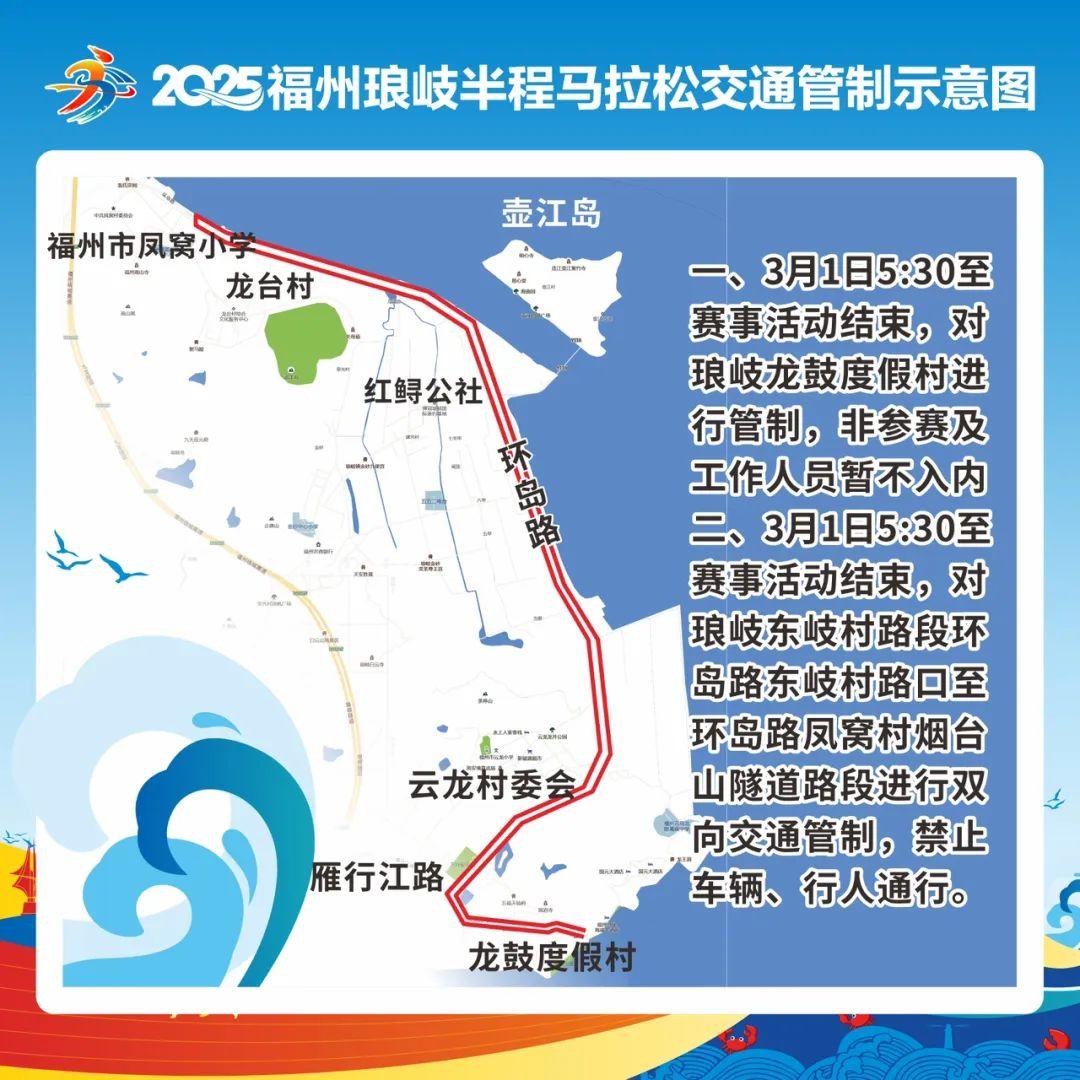 2025年3月1日福州市马尾区琅岐镇东岐村路段至环岛路凤窝村路段将举行“2025福州琅岐半程马拉松赛”,为确保活动期间周边道路交通安全顺畅,根据《中华人民共和国道路交通安全法》第三十九条规定,决定2025年3月1日对赛事周边部分道路实行临时交通管制。现通告如下: