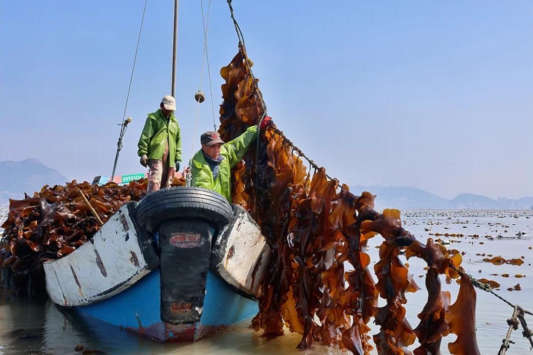 得益于连江自主培育的“黄官1号”高产品种今年海带长势喜人,现在采收的是今年1月种下的海带,亩产2.5万公斤左右,再生长2个月,等5月采收时亩产可达3.5万公斤左右。