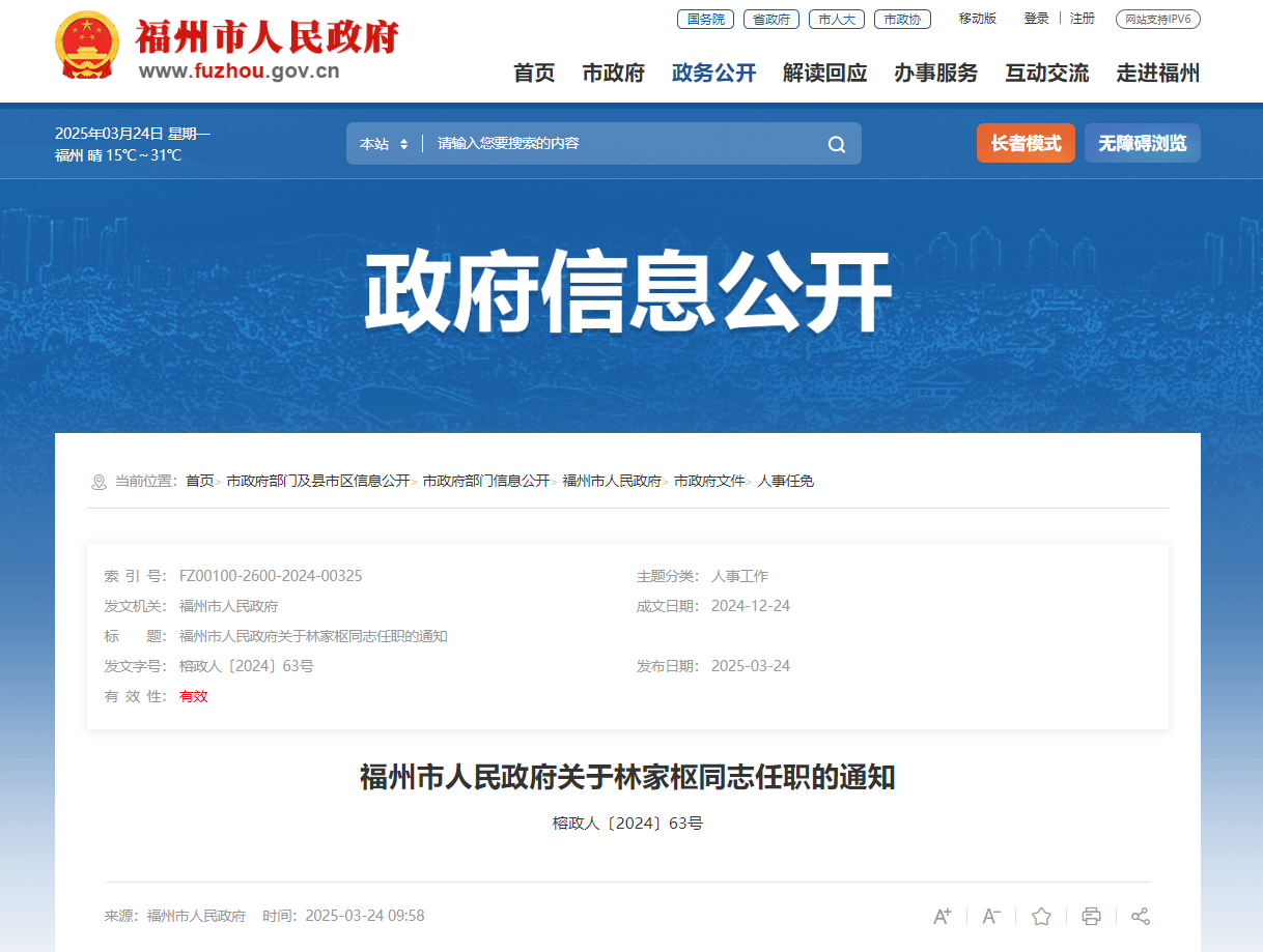 最新!福州市人民政府发布一批人事任免通知。