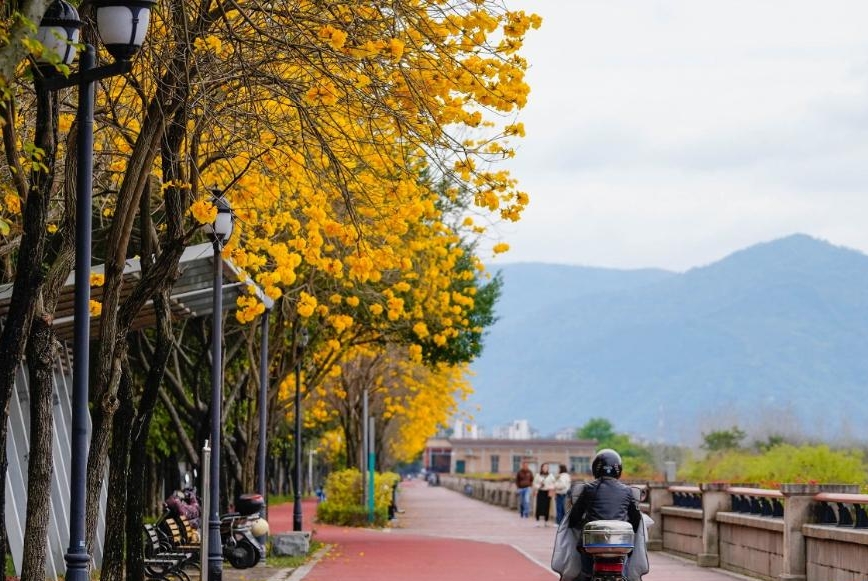 春日的江滨步道,因为黄花风铃木的盛放,多了几分惬意(拼版照片)。新华网 蒋巧玲 摄