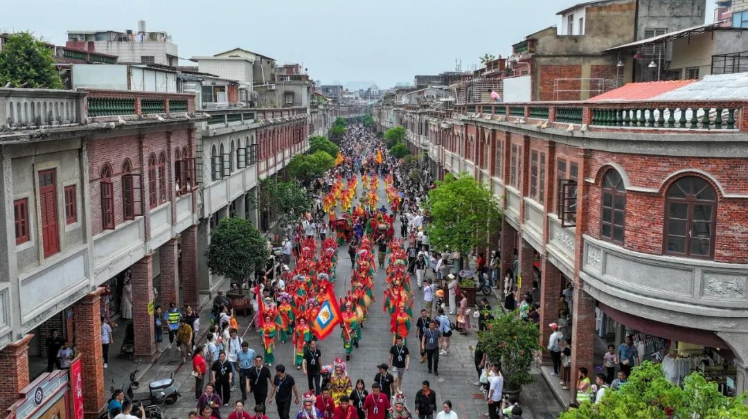 泉州宋江阵时隔40年重启,游客街头邂逅108位“簪花大侠”。(陈英杰 摄)