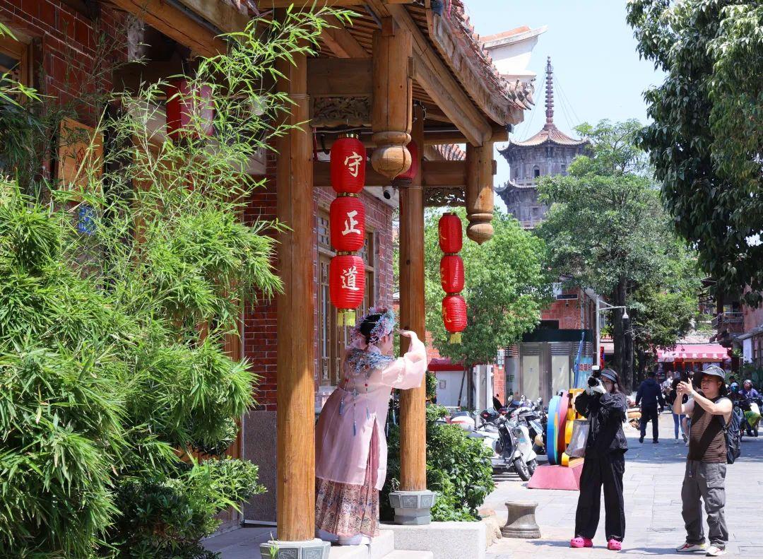 古榕巷定格“花映古塔”的限定景色。(王柏峰摄)
