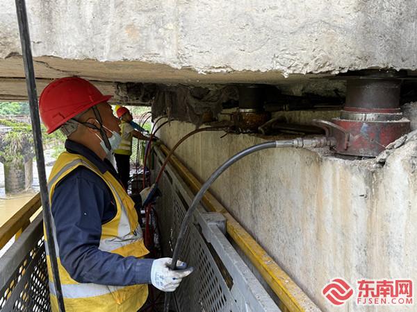 三明市公路中心桥梁养护技术人员化身“桥梁医生”换支座。