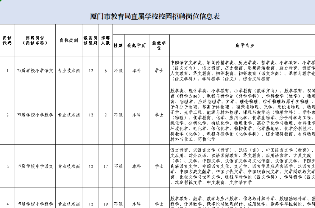 市教育局和翔安区教育局近日发布校园招聘优秀毕业生公告,总计105人,其中市直属校81人,翔安区24人。