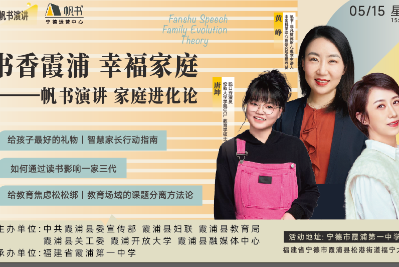在第32个国际家庭日来临之际,为深入贯彻习近平总书记关于"注重家庭、注重家教、注重家风"的重要指示精神,5月15日,由霞浦县委宣传部、妇联、教育局、关工委、开放大学及融媒体中心联合主办的"书香霞浦·幸福家庭"家庭教育公益讲座在霞浦一中举行。本次活动吸引了教育专家、家长代表、帆书书友等近千名社会各界人士热情参与,共同探讨新时代家庭教育创新路径。