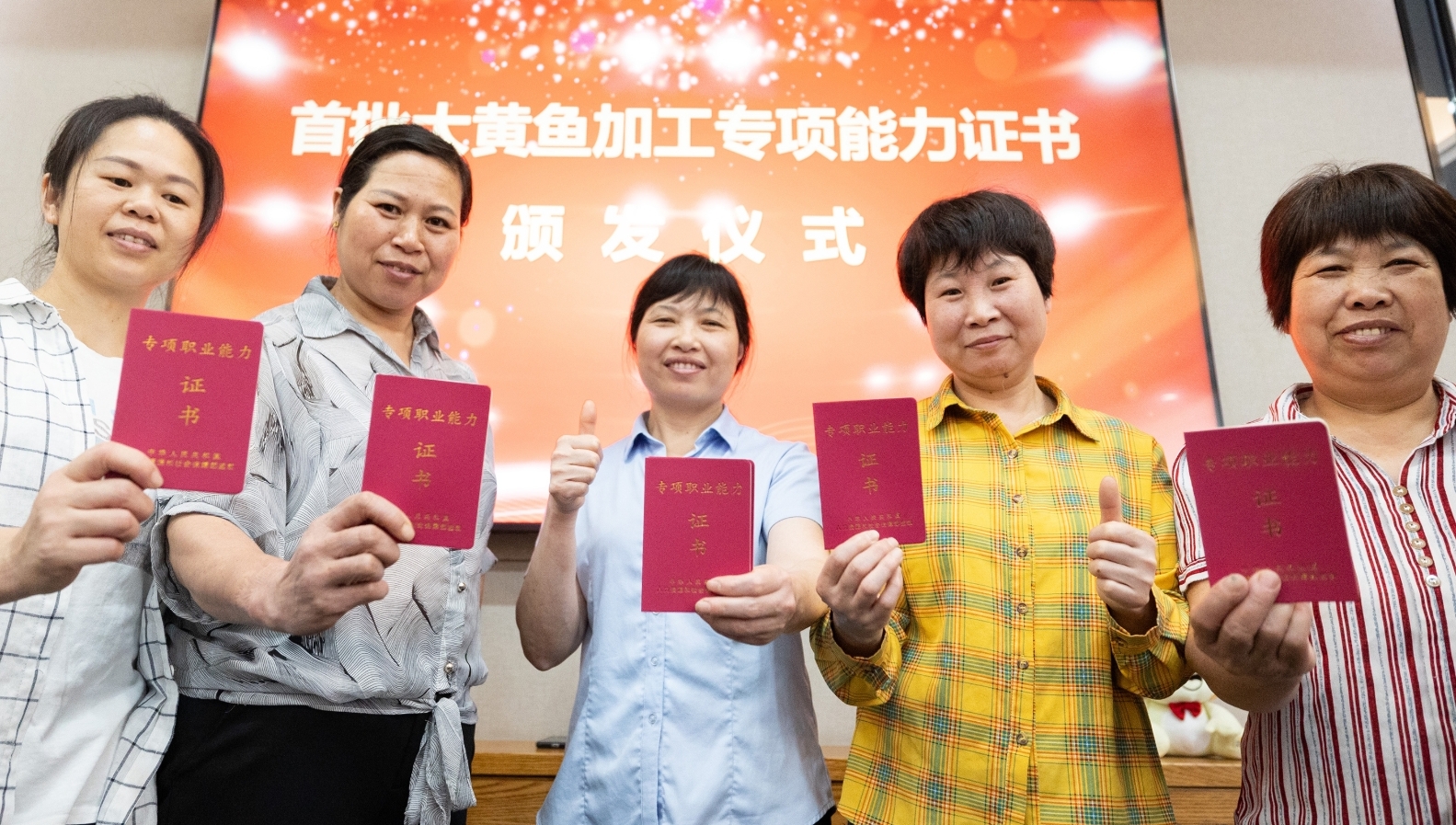 当天,蕉城区人社局、海洋与渔业局送证进企业,陆续向首批48位通过“大黄鱼加工”专项能力考核的从业者发放证书。据悉,这是全市首批,也是全国首批领证的大黄鱼加工专项技能人才。