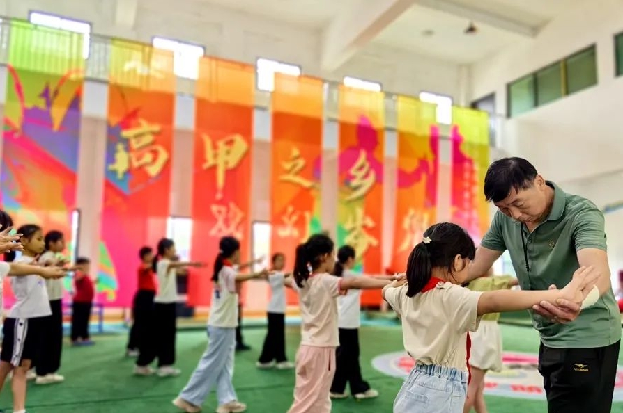 “云手要像抚流水;肩要松,气要沉;腰是轴,眼是灯,灯不亮轴怎么转……”年近六旬的传习所老师林国春不时提高嗓门向孩子们提醒动作要领。看到有谁动作不到位,他就快速走近,手把手示范。