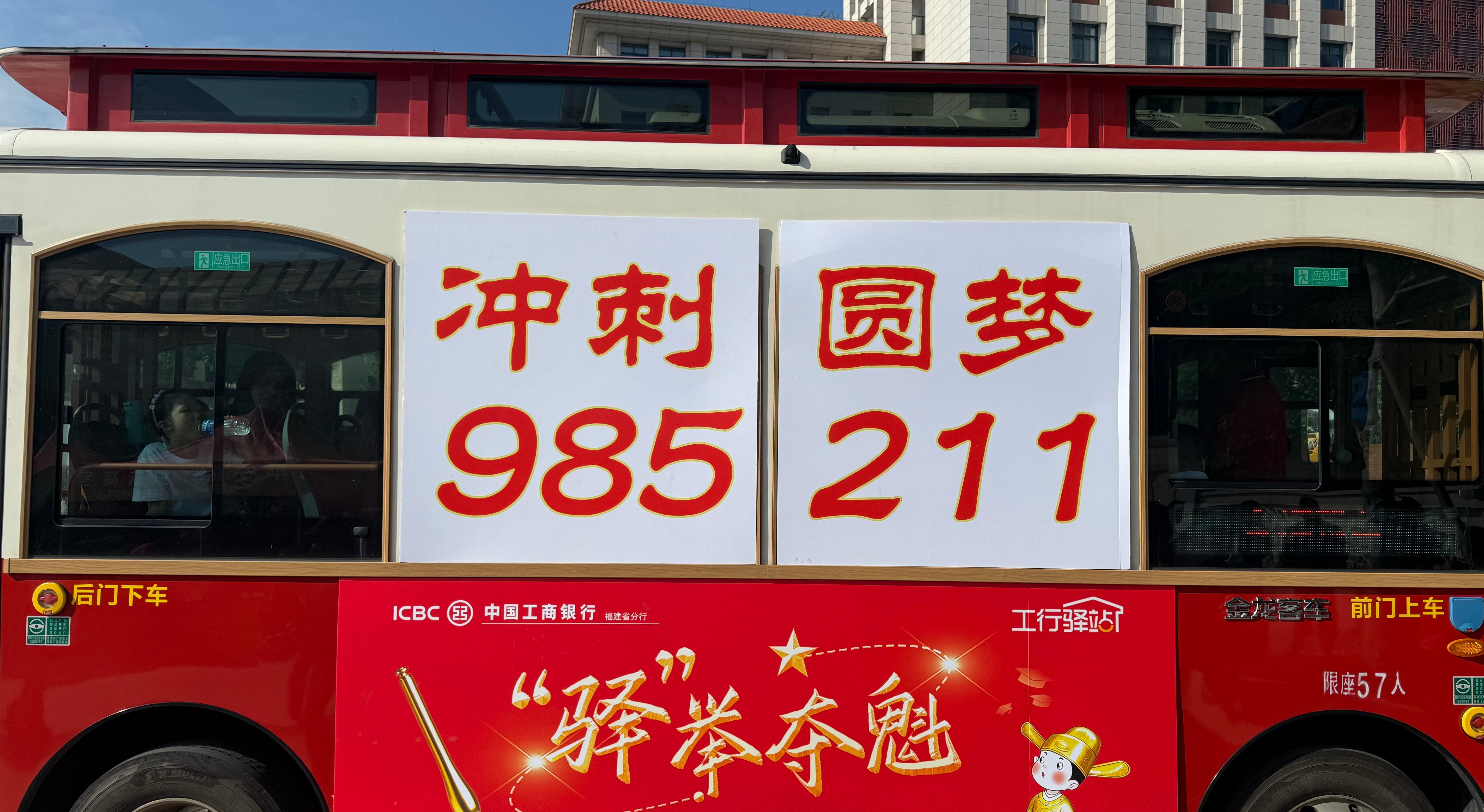 车身上有“冲刺985”“圆梦211”的祝福标语(宋万春 摄)
