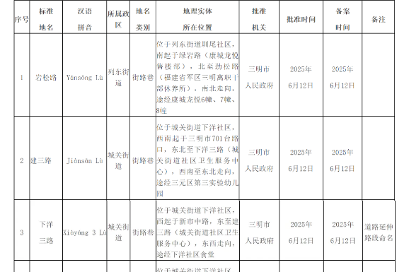 三明市政府批复了 这7条道路正式命名