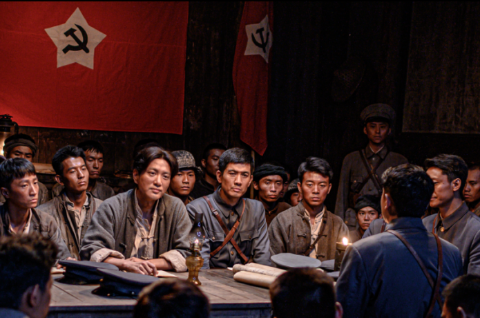 《浴血荣光》不是一部传统意义上的革命历史剧,而是一曲热血澎湃的“青春战歌”。剧中,毛泽东、周恩来、朱德、陈毅、贺龙、叶挺、刘伯承等革命先驱褪去历史课本中的“伟人光环”,展现出意气风发的青春本色。他们会在南昌起义前夜紧张得彻夜难眠,在进驻长汀后为“军队作风建设”问题争得面红耳赤,更在血与火的考验中完成独立自主领导中国革命道路的蜕变。青年演员们用生活化的表演撕掉历史的厚重标签:王仁君饰演的毛泽东,会一点点地拈起杨开慧辗转寄来的碎掉的月饼,细细地品尝;王志飞饰演的朱德,砍竹制扁担,手艺纯熟;亲如一人的“朱毛”,为军队建设问题也有气急了拍桌的时刻……这些曾被历史简化为“先辈”的名字,在剧中重新拥有了青春的脉搏——对家人战友贫苦大众有柔软深情,意见相左时也会急躁、会冲动,却始终燃烧着信仰的火光。