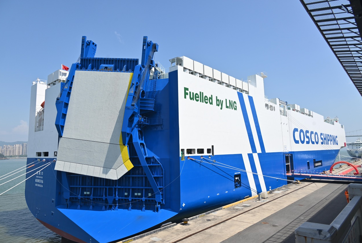“成康口”轮是由厦门船舶重工股份有限公司(以下简称“厦船重工”)承建的超巴拿马型LNG双燃料汽车滚装船,可装载7500个标准车位,交付后将由中国远洋海运集团运营,首航计划从厦门驶往上海港后执行汽车出口任务。这一项目标志着中日航运产业链协作的深化,也为中国新能源汽车出口进一步提供运力支撑。