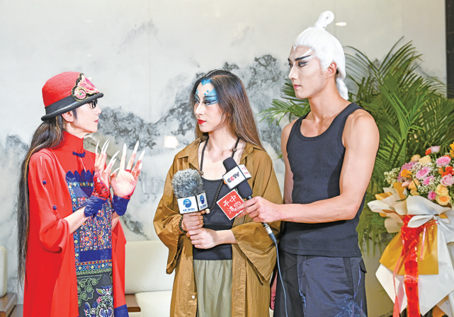 杨丽萍(左)和主演肖淇心(中)、大朱(朱凤伟)接受媒体采访。