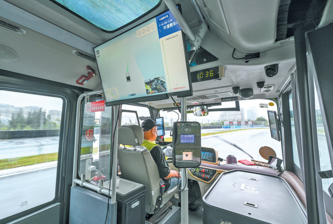 安全员在自动驾驶车辆上保障测试安全。林君斌 摄