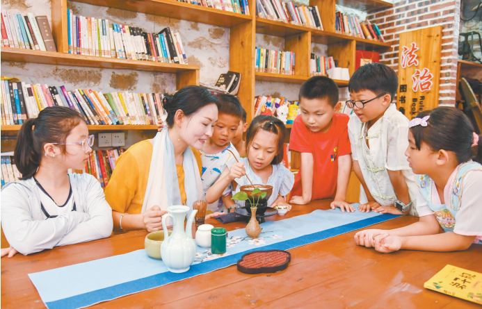 从环保理念到文化根脉,不同地方的公益课堂各有侧重。在海坛片区城南村,国学公益课堂成了孩子们了解传统文化的好去处。课堂上,老师带领孩子们行上课礼、读《弟子规》、体验宋代点茶,孩子们在一言一行、一茶一礼中感受着传统文化的魅力。“我每周来两次,能学到不少礼仪知识,对传统文化也有了更深的了解。”小朋友许之恒说。
