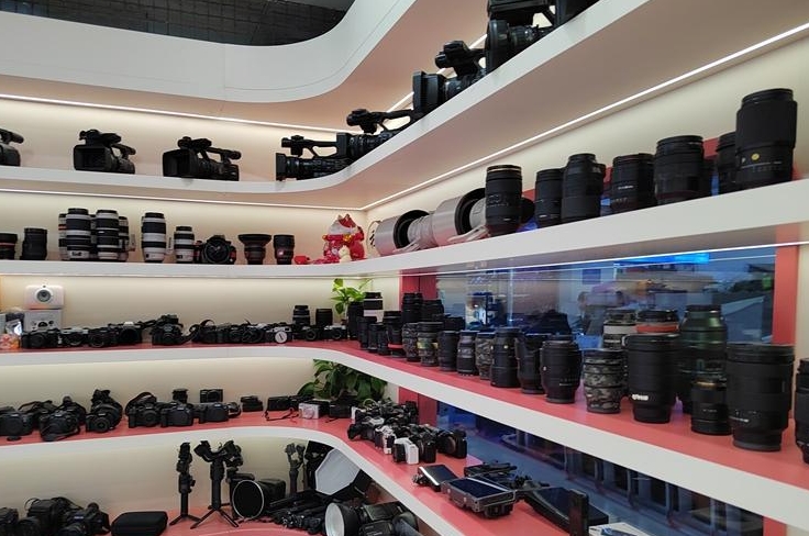 影像用品租赁门店的货架上,各种影像设备琳琅满目。