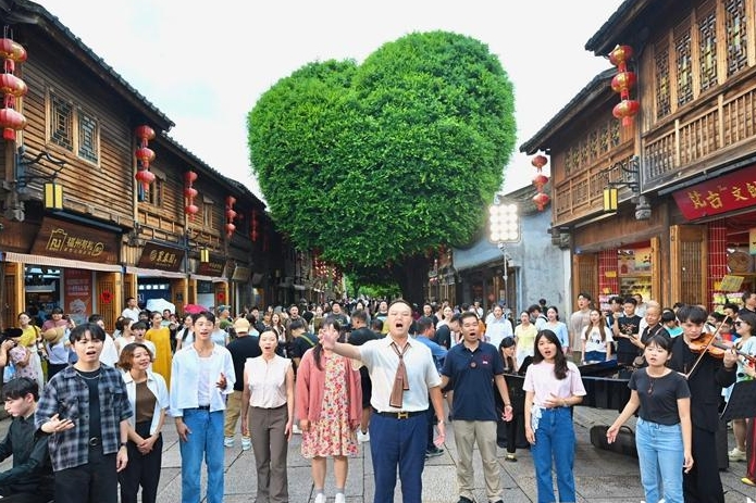 “一辆穿越时空的火车,翻越山,渡过河……”5日上午,三坊七巷爱心树下响起动人的歌声,吸引不少市民游客驻足。当日,第十三届海峡青年荟·“烽火同声——纪念抗战胜利暨台湾光复80周年两岸青年合唱快闪活动”在此举行,邀请两岸音乐艺术类青年联袂参演,用歌声唤醒共同历史记忆,以艺术力量凝聚民族情感。