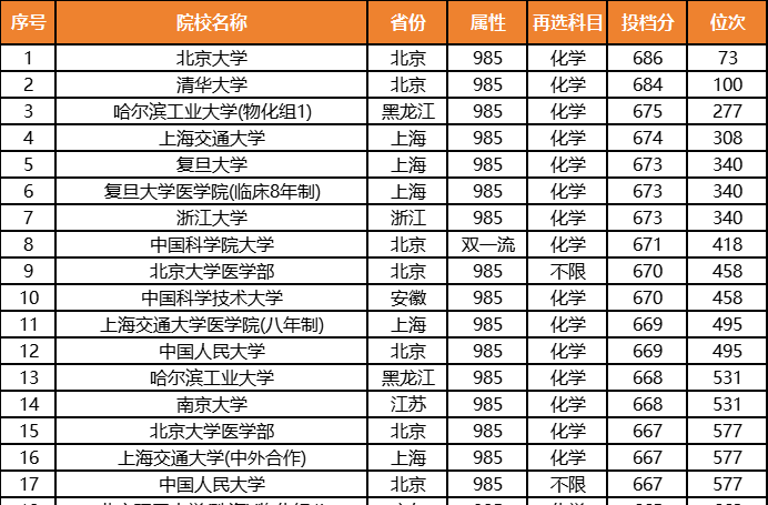 物理组前50名专业组中,仅4个组(北大医学部、人民大学、南开大学、武汉大学)不限选科,其余均要求选考化学,凸显化学在理工科中的核心地位。