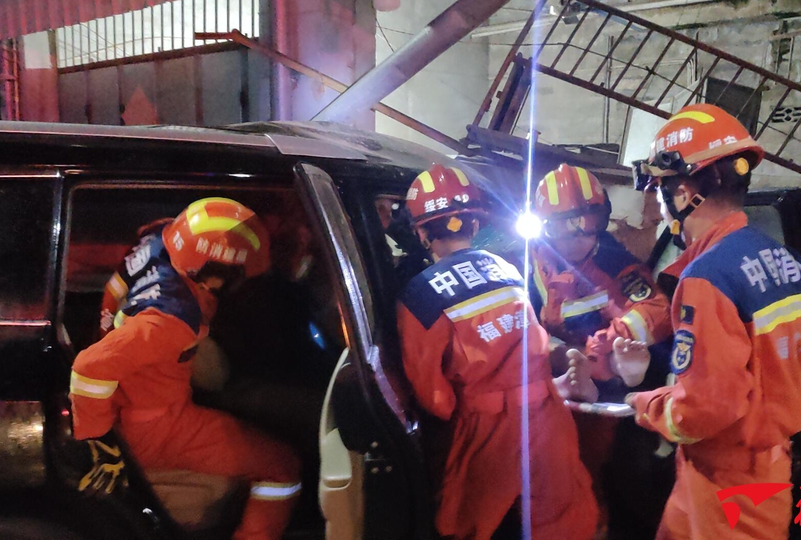 受台风影响,8月14日03时43分,漳浦县绥安镇乌潭埔往石榴镇方向,一辆小车撞到路边房子,人员被困。漳浦县消防救援大队接到报警后迅速出动1辆消防车7名消防员赶赴现场施救。