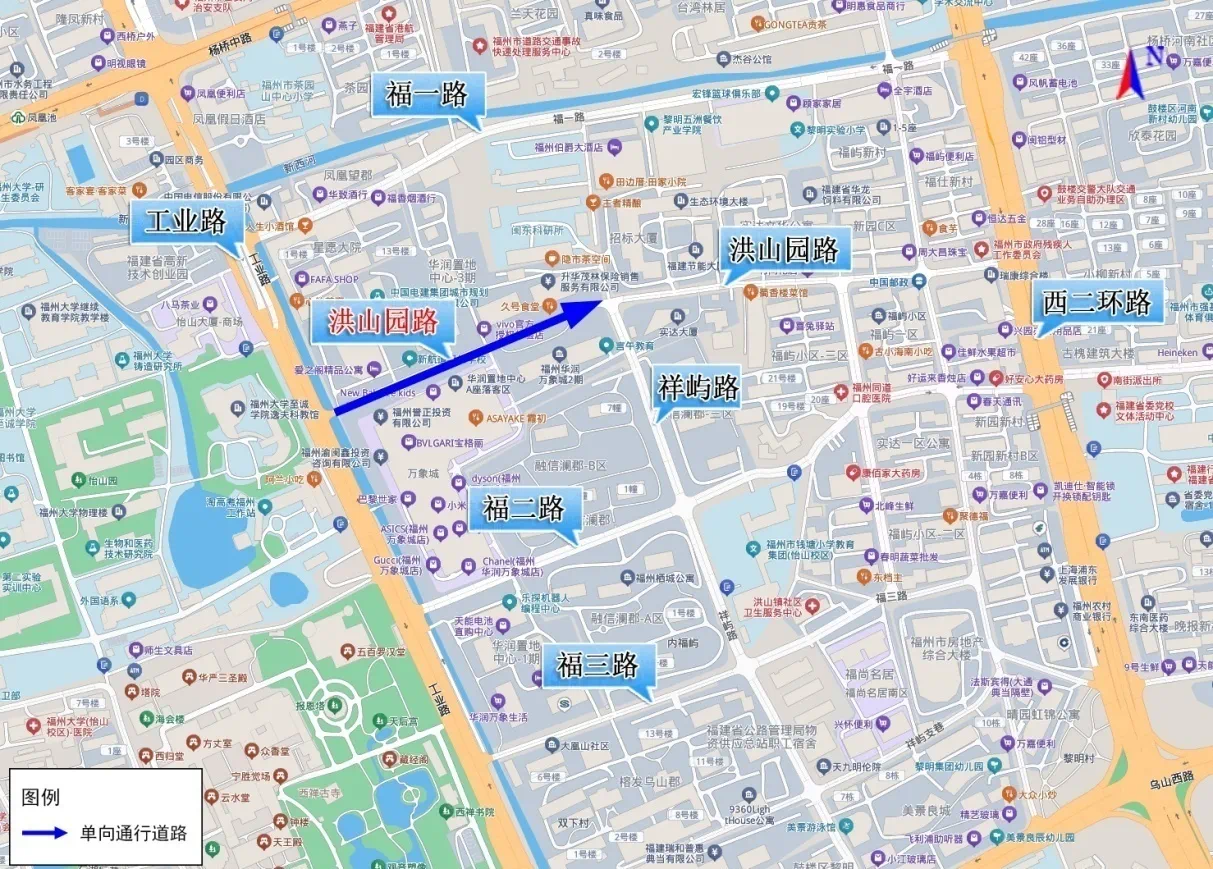 其中,洪山园路(西起工业路口,东至祥屿路口)实行机动车由西往东单向通行。
