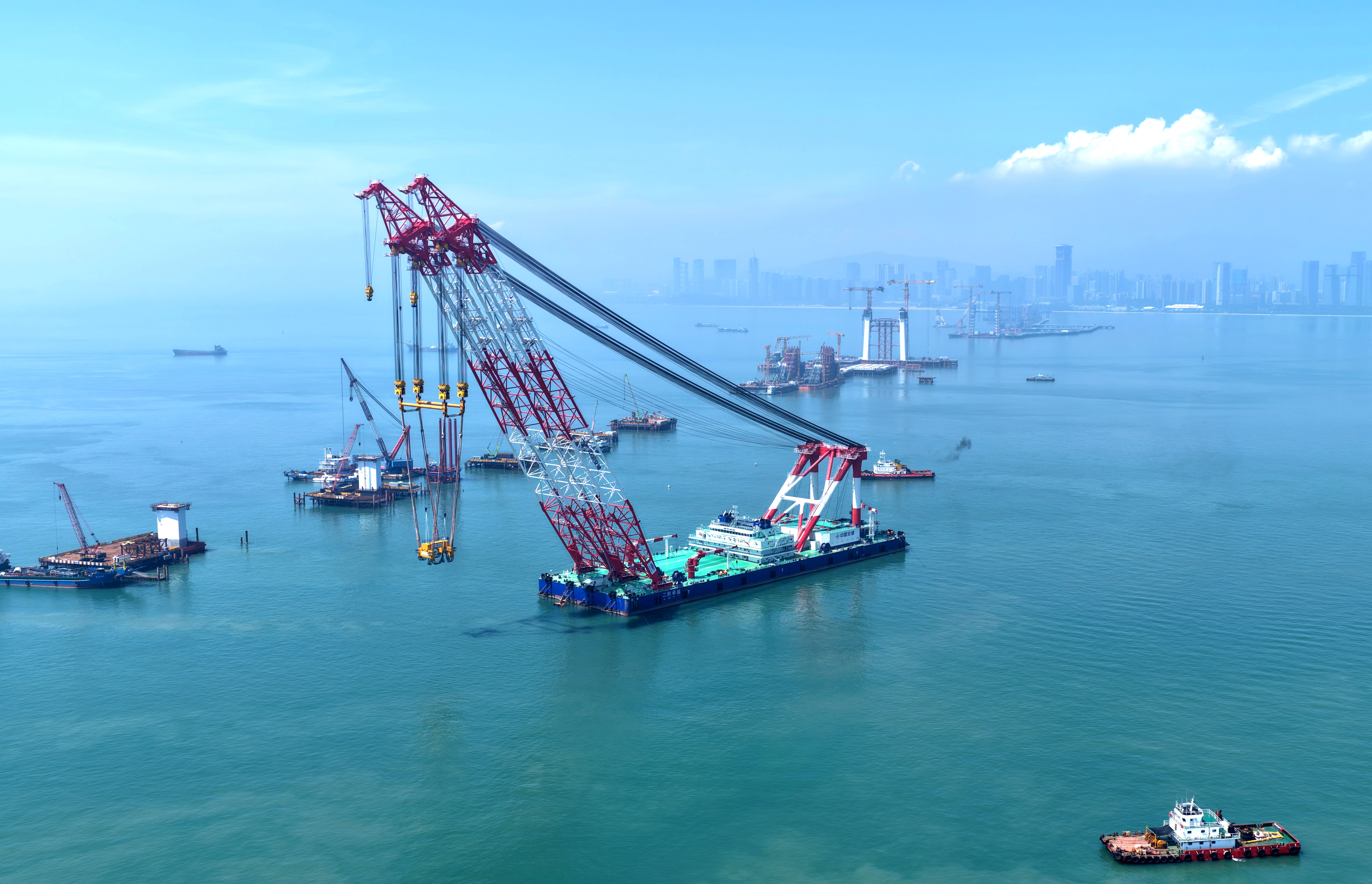 8月23日,厦金大桥(厦门段)施工现场一派繁忙景象,工人穿梭作业,机械轰鸣运转,主塔锚碇施工正紧张有序推进,建设热潮扑面而来。