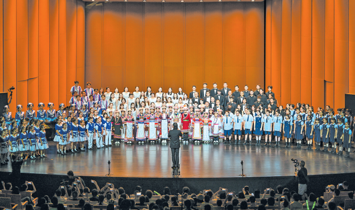 在音乐会尾声,全场合唱《同一首歌》,展现了人声艺术极强的表现力与情感凝聚力。甘肃省陇南市文县小花椒童声合唱团的孩子们也身着民族盛装加入,团员王春阳激动地说:“以前从来没有参加过这么大规模的合唱,能够和哥哥姐姐们一起唱歌非常开心。希望长大后也能像他们一样,用优美的歌声打动观众。”