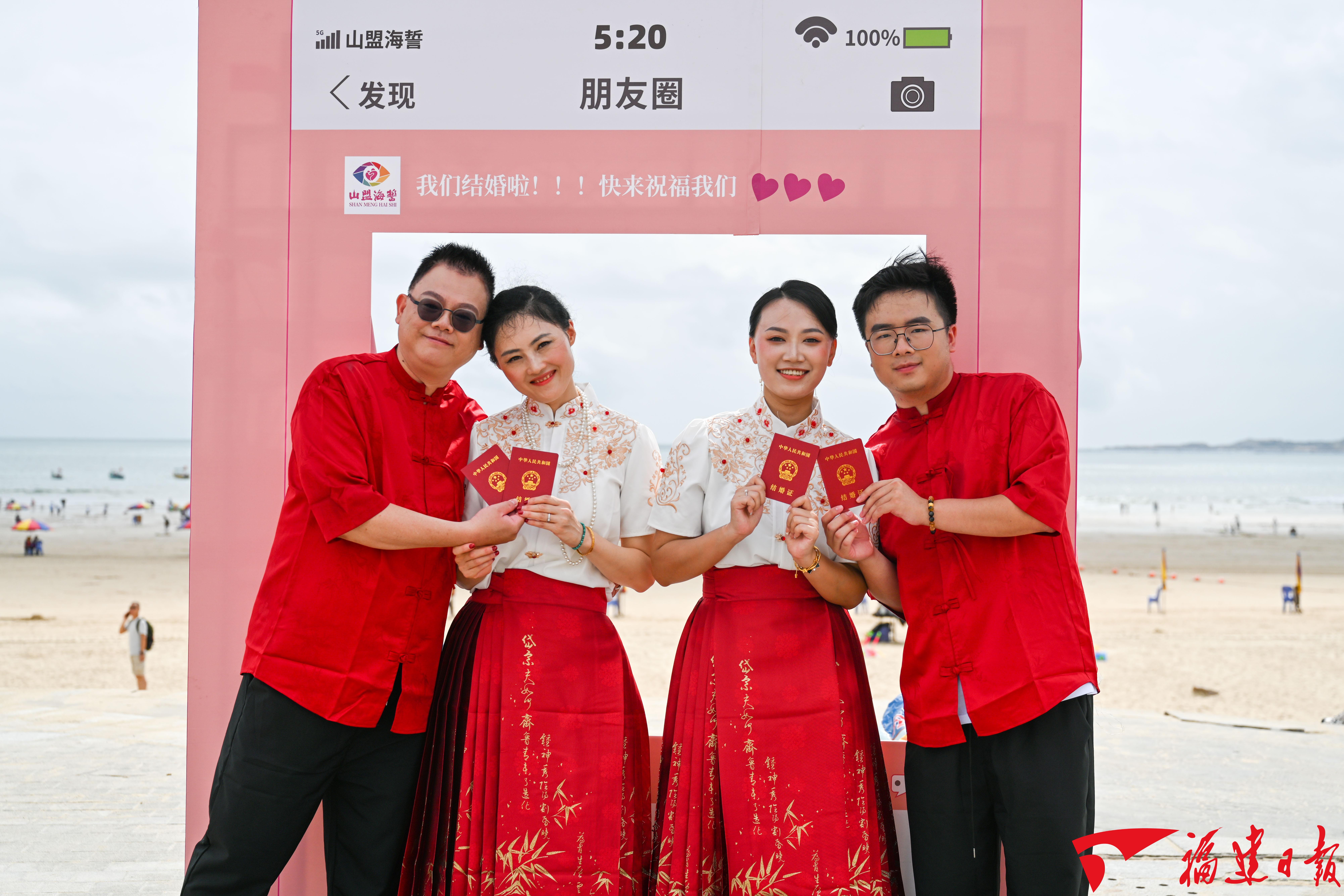 “我们结婚啦!”在打卡点前,快门声此起彼伏。比心、飞吻、牵手……闽台新人们对着镜头不停变换姿势拍照,定格美好瞬间。