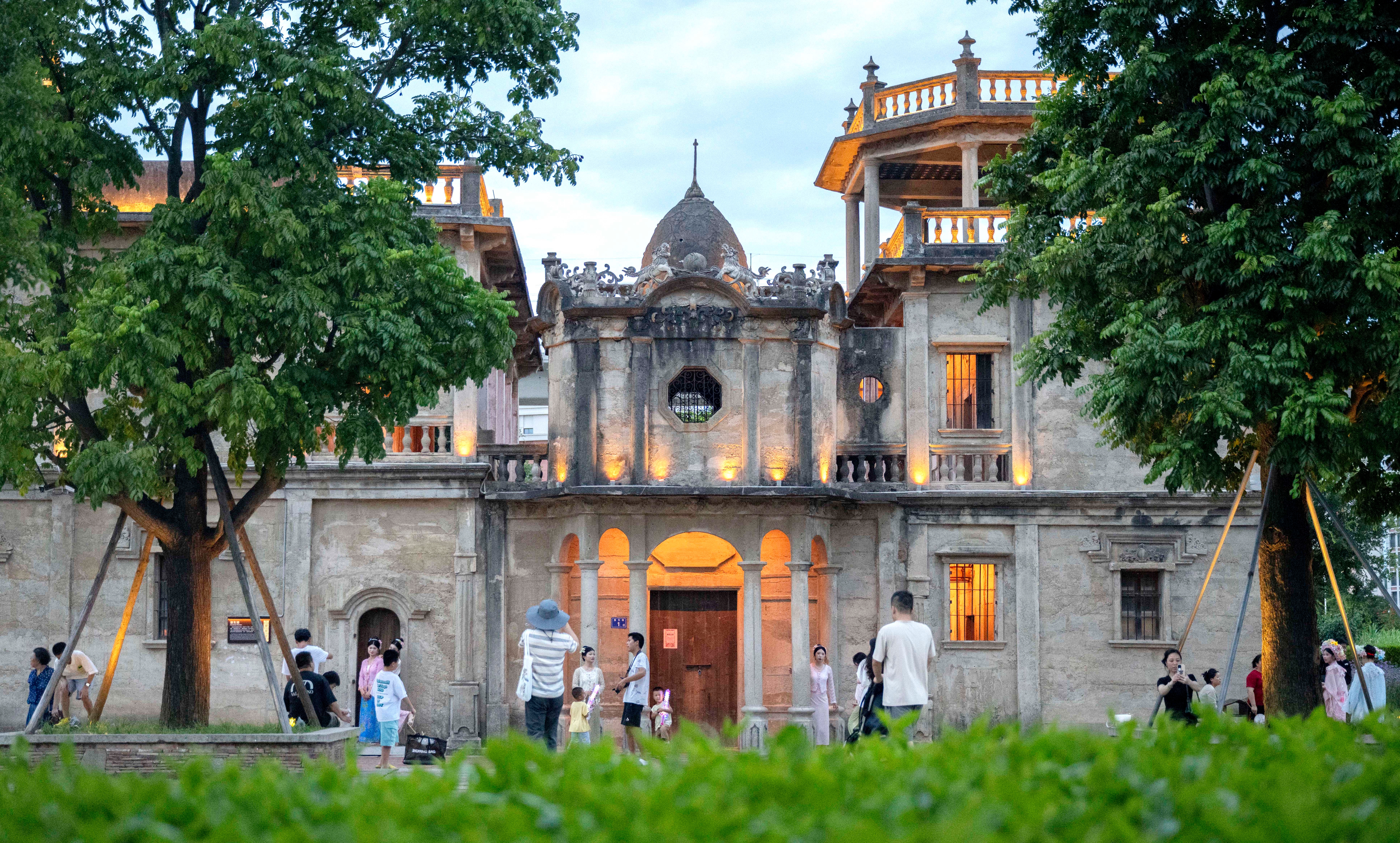 8月19日,游客们在晋江梧林古村落的朝东楼前打卡拍照。朝东楼是1930年由菲律宾华侨蔡朝东委托西班牙设计师建造,是梧林华侨建筑群中最早的西式洋楼。原计划安装泉州最早的电梯井,因1937年抗日战争爆发,业主将已筹集的10万银元装修款全额捐赠国民政府支援抗战,导致建筑未完成装饰,形成独特的水泥素面外墙特征。 王毅 摄
