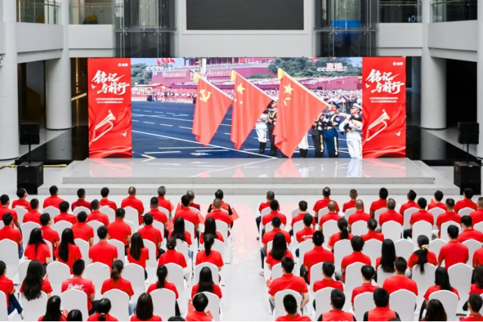 当天上午,企业总部及各生产基地同步开启活动,员工们身着统一红色服装,党员佩戴党徽、手持国旗党旗,在多个会场共同观看阅兵直播。当屏幕上各军种方阵迈着整齐步伐通过,国产主战装备列阵亮相时,现场不时响起阵阵掌声,大家沉浸式感受国威军威,深刻体会到今日和平生活的来之不易。