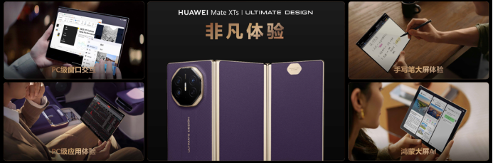 海峡导报 • 新福建新闻客户端 9月4日,全新HUAWEI Mate XTs 非凡大师三折叠屏手机焕新登场,首度将PC版应用与PC级交互体验引入手机,结合鸿蒙操作系统5.1、全新手写笔HUAWEIM-Pen 3,进一步强化三折叠在金融理财、移动办公、影音娱乐等场景下的生态应用适配,带来“大”有不同的非凡体验。同时,华为ULTIMATE DESIGN非凡大师推出全新徽标,以极致的产品致敬这个时代的非凡大师,是极致美学、极致工艺、极致创新的集大成者。时隔一年,华为依然是业界唯一推出三折叠手机的厂商。