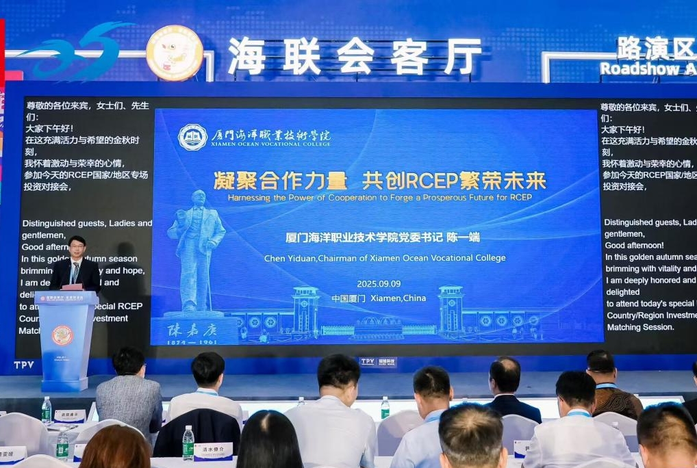 作为本次活动的主要承办方,厦门海洋职业技术学院党委书记陈一端作致辞发言。他表示,在RCEP协定深入实施的背景下,本次对接会既是响应国家深化区域经济合作战略的具体行动,也是发挥投洽会平台优势、链接RCEP国家资源的重要举措。学校将充分发挥自身在海洋领域人才培养、校企合作、技术服务等方面优势,为推动RCEP成员国间的产业合作与人才交流提供支持,助力区域经济协同发展。