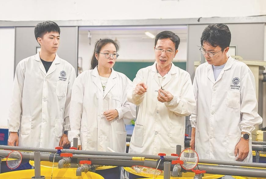 郑乐云(右二)指导学生开展膨腹海马种质创新研究。(受访者供图)