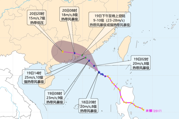 福建日报·新福建客户端9月18日讯(记者 何祖谋)位于南海的热带低压已于18日14时增强为今年第17号台风“米娜”,20时中心距离广东省汕尾市东南方向约325公里,中心附近最大风力8级(20米/秒,热带风暴级)。预计,“米娜”将以每小时15~20公里的速度向西北方向移动,强度逐渐增强,并将于19日下午至晚上在广东中东部一带沿海登陆。