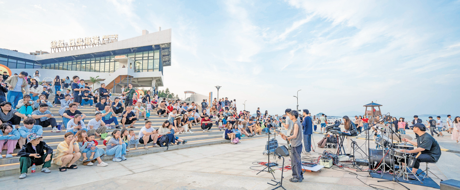 在龙王头海洋公园,不少人坐在石阶上听WAVEⅡ乐队唱歌。