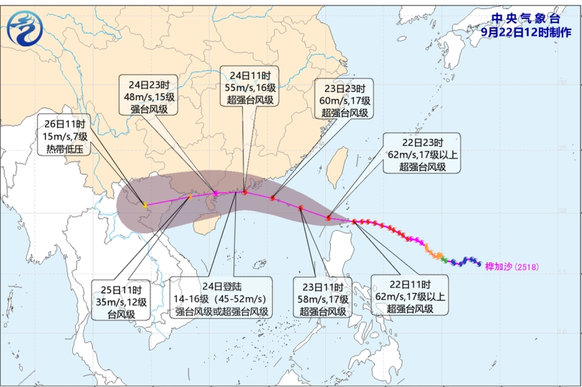 今年第18号台风“桦加沙”,今天(22日)11时中心距离东沙岛东偏南方向约590公里(北纬19.3度、东经122.4度),中心附近最大风力17级以上(62米/秒,超强台风级)。预计,“桦加沙”将以每小时20公里左右的速度向偏西方向移动,于23日凌晨进入南海东北部海面,逐渐向广东中西部至海南岛东北部一带沿海靠近。