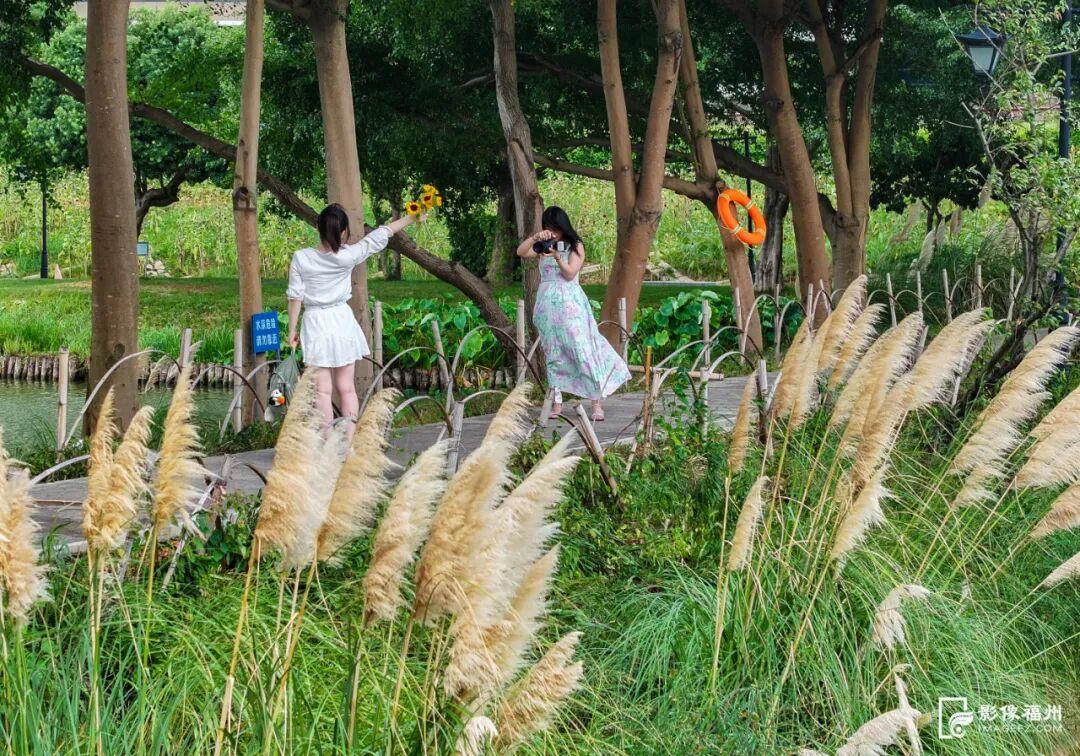 ▲花海公园江边步道旁的矮蒲苇吸引不少市民拍照观赏