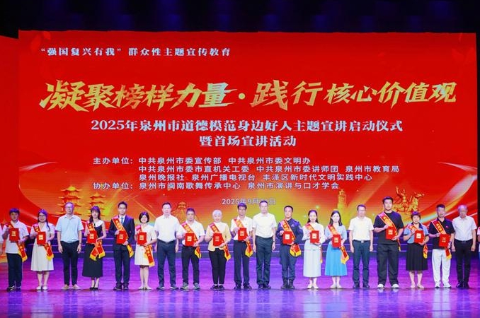 为弘扬崇高道德精神,着力培育时代新人,9月22日,2025年度泉州市“凝聚榜样力量·践行核心价值观”主题宣讲启动仪式暨首场宣讲活动在泉州市闽南歌舞传承中心举行,通过宣讲的形式,宣扬助人为乐、见义勇为、诚实守信、敬业奉献、孝老爱亲等道德典型的崇高精神,在全市形成学习、关爱、崇尚、争当先进典型的浓厚氛围。