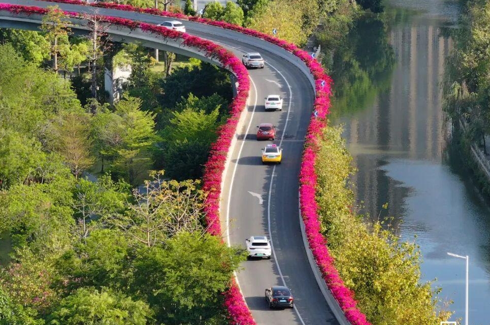 本周开始。螺洲互通高架桥上,双色三角梅花带上线,为进出城的市民带来高颜值的道路风景。花带全长17.737公里,全市排名第一。在没有极端天气影响的情况下,三角梅花期可以维持约一个月。