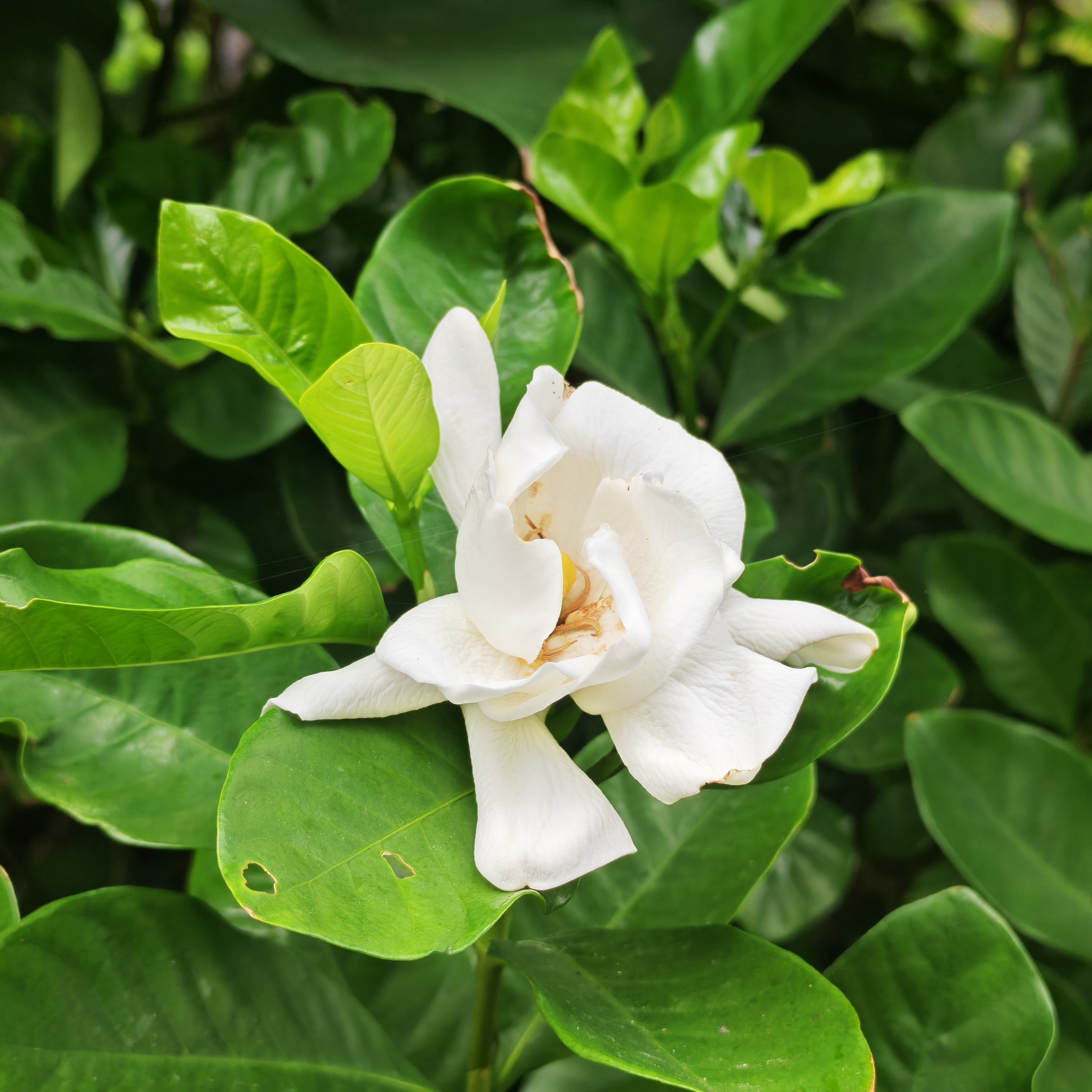 绿叶衬着这朵白色小花,愈发显得洁白耀眼。我走近细看,黄色花蕊被两层花瓣包裹,叶片上还有几个小虫眼。凑近轻嗅,淡淡的栀子香迎面而来。从夏到秋,这朵花仿佛凝聚了阳光的能量,携芬芳而至。