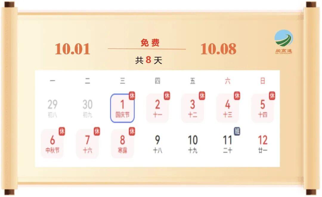 2025年国庆中秋假期高速公路免费通行时间为10月1日0时至10月8日24时,针对7座以下(含7座)的载客车辆实施免收高速通行费政策,以车辆驶离高速公路出口收费车道时间为准。