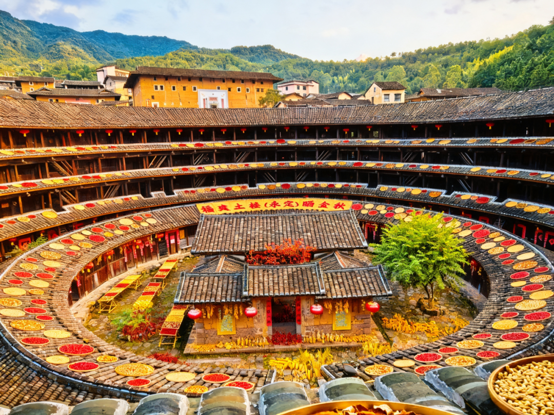 金风送爽,稻谷飘香。当第一缕秋光洒向福建土楼(永定)景区的青瓦飞檐,一场晒秋盛宴正在这里徐徐展开。