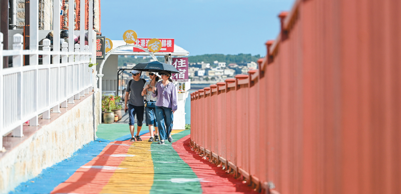 在北港村文创休闲广场,红、黄、蓝三色彩虹步道令人眼前一亮,在阳光的照耀下成为一道靓丽的风景线,吸引许多市民游客拍照打卡。“在彩虹步道拍照真的很出片,后面的海很好看,风格很独特。”来自南京的游客汤思宁说。