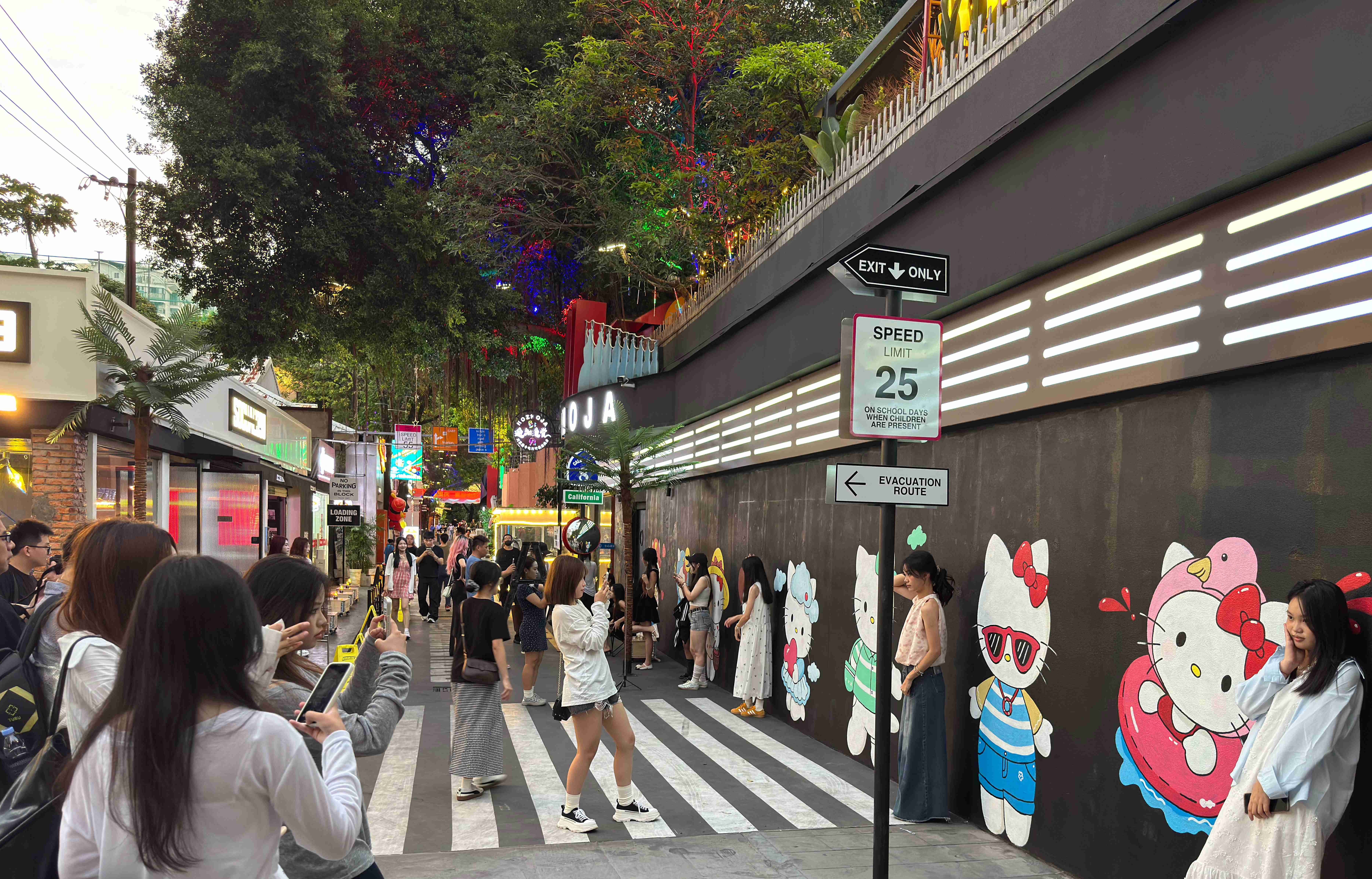位于勺园里文创园的Hello Kitty打卡墙也十分火爆。憨态可掬的卡通形象涂鸦吸引了许多年轻女性。在一面约十米长的打卡墙前,同时有五六个女生正在摆姿势与墙上的卡通人物合影。“和舍友一起过来的,听说这里拍照很出片。”一位从大学城过来的学生说道。