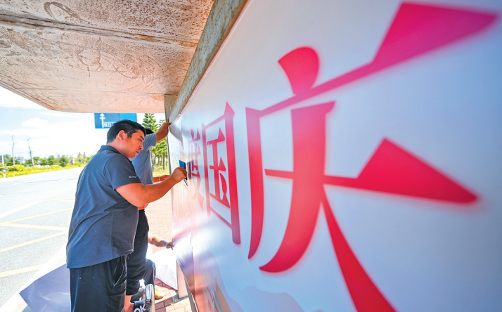 在南岛中路,记者看到工人正在把国庆节主题海报贴在公交站的宣传栏上,海报以中国红为主色调渲染节日氛围。“通过视觉元素传递对祖国的祝福,也想让群众感受到浓厚的节日氛围,增强大家的幸福感。”苏平片区管理局党群工作处一级主任科员施玲娟说。