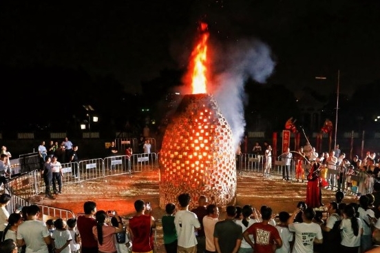 醒狮表演落幕,焦点转向广场中央早已搭建好的“烧塔仔”。与会嘉宾移步至塔前,共同点燃火种,火苗迅速窜起,沿着砖块缝隙向上蔓延,伴着噼里啪啦的燃烧声,很快将整座塔身映得通红。市民游客纷纷围拢过来,火光映亮一张张笑脸,双节的喜悦,平安、兴旺的寓意在温暖的光晕中愈发浓厚。