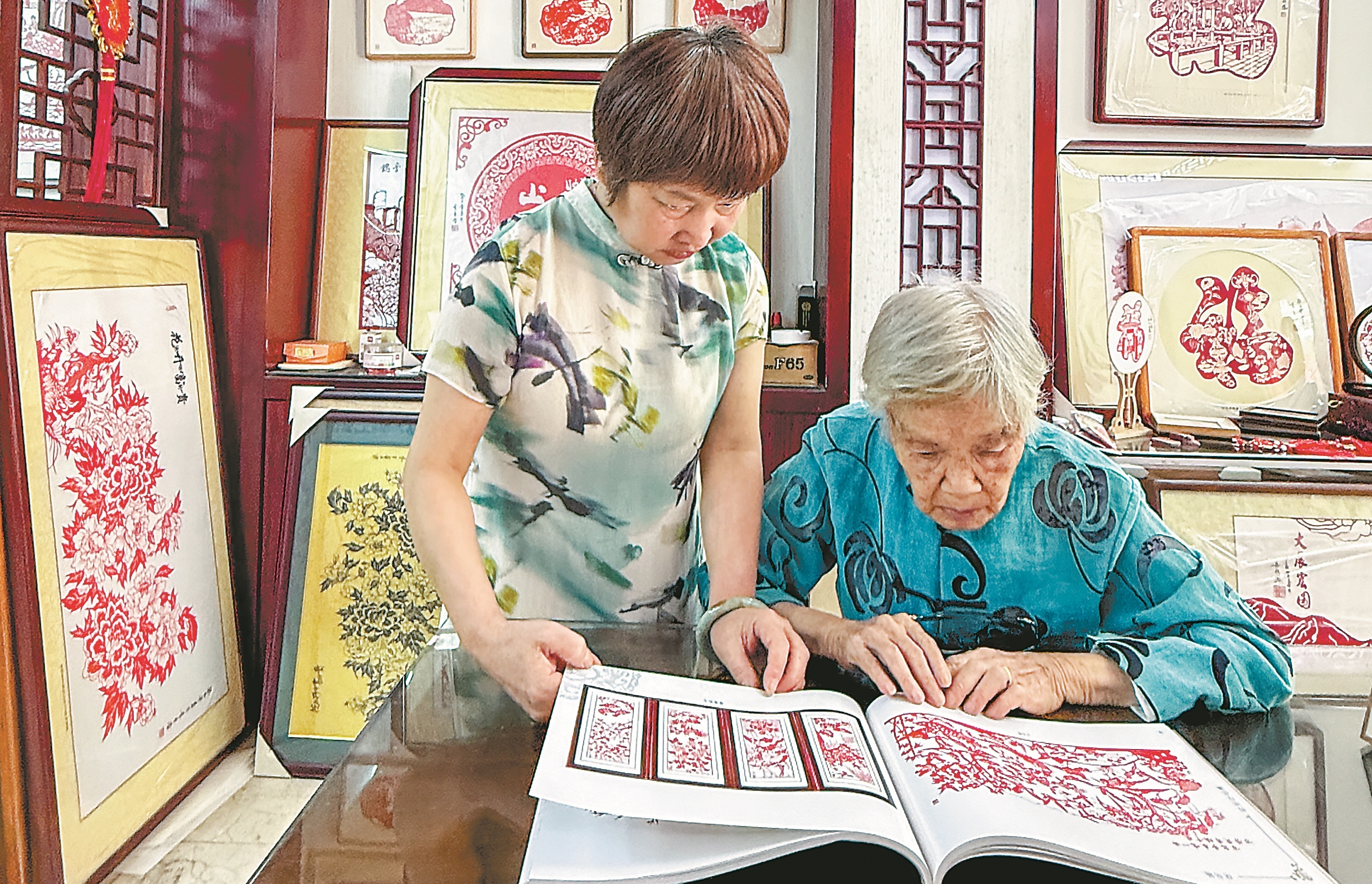 袁秀莹(右)和吴秋凤(左)探讨剪纸技艺。