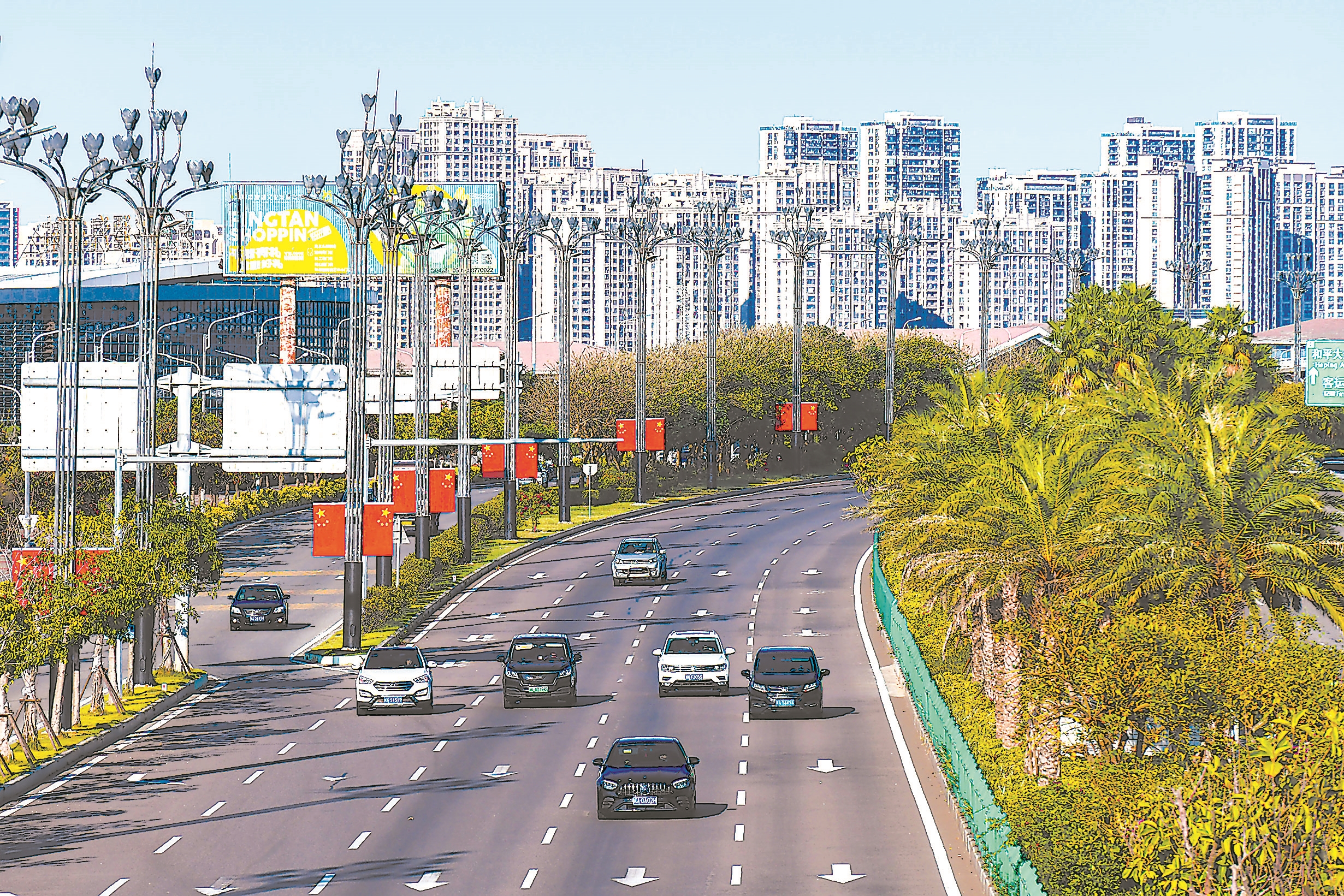 10月1日,平潭道路旁红旗招展,在棕榈树的映衬下,与城市建筑、往来车辆交织,满是蓬勃气象。