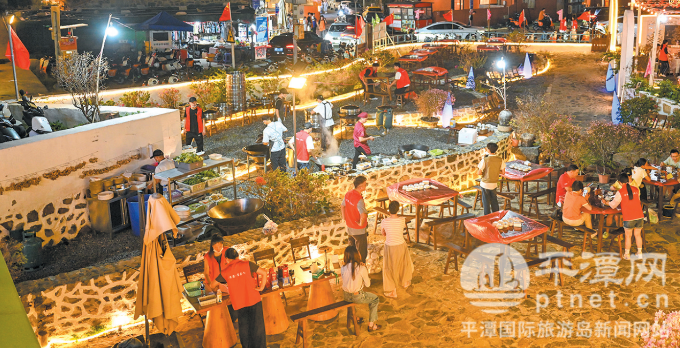 2日晚上,夜幕降临,用餐游客陆续来到活动现场。烹饪区内,一道道兼具颜值与风味的平潭特色菜快速出锅,香气弥漫。此次活动将整个后厨搬到了户外,全景呈现平潭办酒席的过程,这样的方式引得不少游客驻足围观。