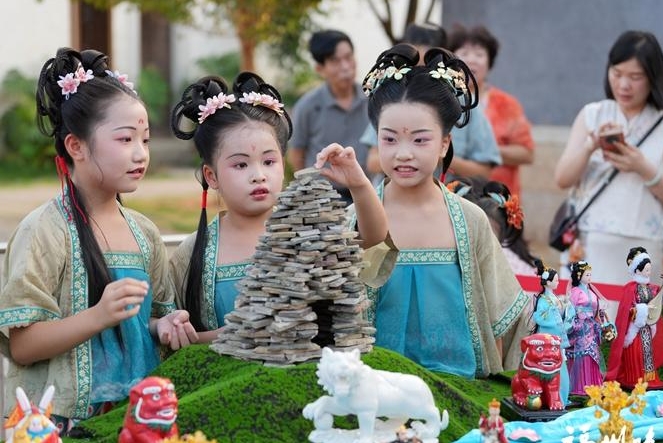 5日,在梁厝特色历史文化街区,孩子们体验中秋摆塔习俗。